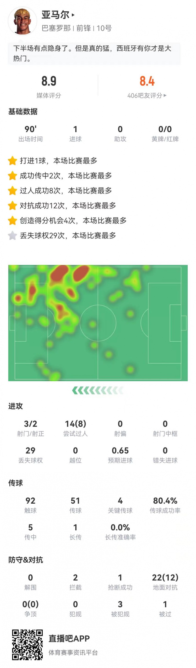 亚马尔3射2正进1球+14过人8成功 4关键传球+29丢失球权+3造犯规