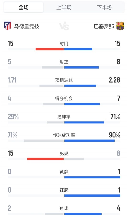 马竞1-2巴萨全场:射门15-15,射正5-8,控球率29%-71%,红牌0-1